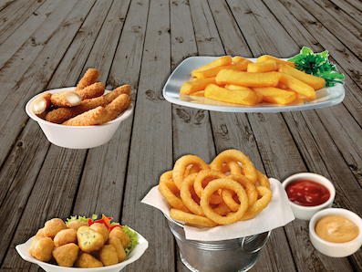 Potato Pops / Onionrings (6 Stk.) / Mozzarella Sticks (5 Stk.) / Chilli Cheese Nuggets (5 Stk.). Dazu 2 Dips gratis.